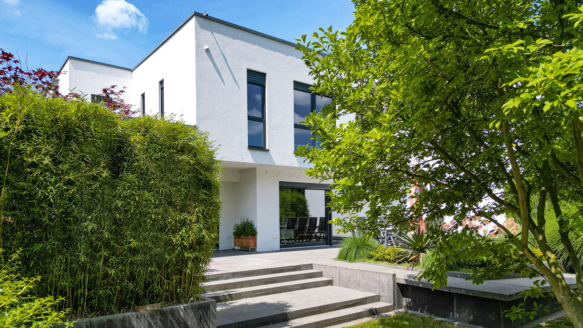 Außergewöhnliches Villen-Anwesen, ca. 1.241 m², Toplage Rheinnähe. Die moderne Gebäudeskulptur signalisiert schon von weitem die Klasse des Objekts. Innen wird die geweckte Erwartungshaltung bezüglich Raumangebot, Interieur, Design und High Tech Komfort mehr als erfüllt. Ein Highlight für sich: Das ca. 25 m² große Atrium mit Olivenbaum und alter Backsteinmauer. Ein luxuriöses Refugium, das mediterrane Gefühle weckt.